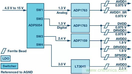 圖3. AD9208 PDN,DC-DC轉換器為所有域供電
