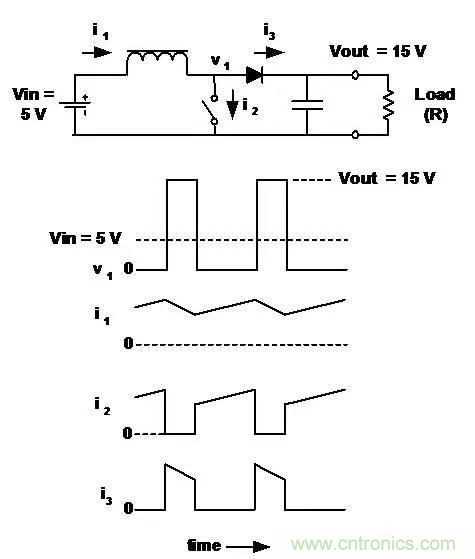 ■輸入電流連續(xù),輸出電流不連續(xù)(與降壓調(diào)整器相反)。