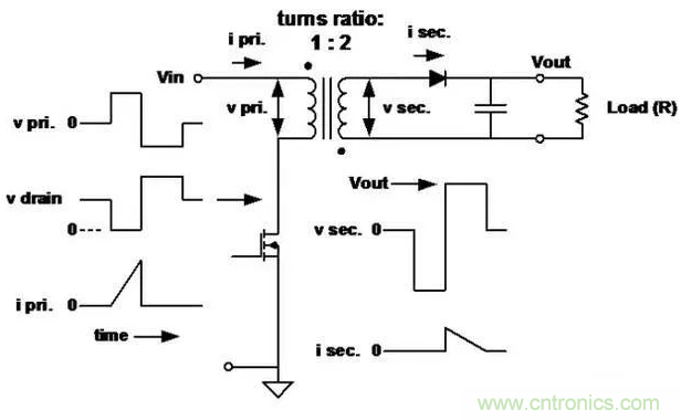 ■此處初級電感很低,用于確定峰值電流和存儲的能量。當初級開關(guān)斷開時,能量傳送到次級。