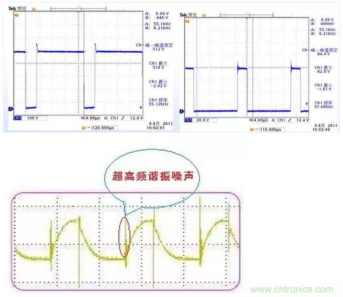 超高頻諧振噪聲主要來源于高頻整流二極管反向恢復時二極管結電容、功率器件開關時功率器件結電容與線路寄生電感的諧振,頻率一般為1~10MHz,通過選用軟恢復特性二極管、結電容小的開關管和減少布線長度等措施可以減少超高頻諧振噪聲。