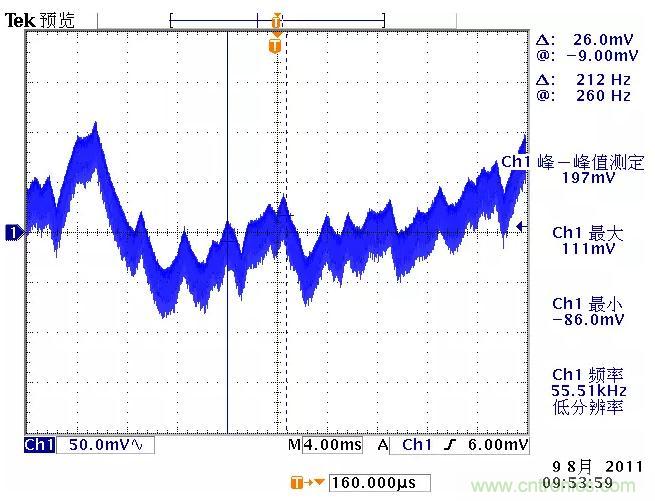 低頻紋波是與輸出電路的濾波電容容量相關。由于開關電源體積的限制,電解電容的容量不可能無限制地增加,導致輸出低頻紋波的殘留,該輸出紋波頻率隨整流電路方式的不同而不同。