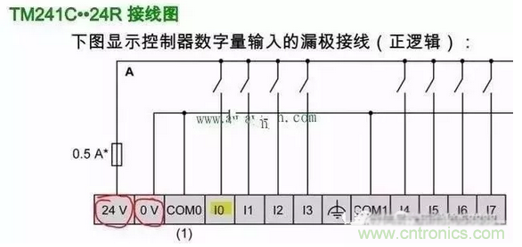如圖三所示,這是PLC 的硬件手冊,我們要想把接近開關的信號接到輸入點I0上,也就是黃色熒光筆部分,該怎么辦呢?其實很簡單,看紅色圓圈的部分,PLC已經為我們提供了輸出電源,我們只需把接近開關的三根線依次接上即可