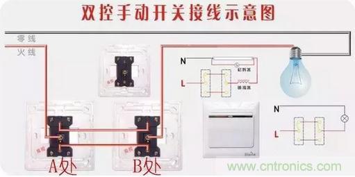 我們就以臥室改造為例:要布設雙控線路,我們首先要從原來的門口開關處(假設圖中A處)甩三根線到B處,接線很簡單,記住“對應接對應,火線進,火線出”,即L1到L1,L2到L2,如下圖