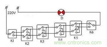 這樣的線路在電梯中常用,當然有時臥室改的細致一點,床左右都加上開關,門口再一個,也是單聯三控線路了。