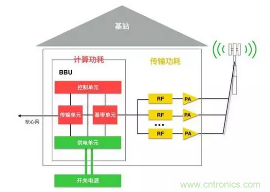 據專業人士分析,部署初期,5G網絡主要采用CU和DU合設+AAU的設備方案,即在基站側采用BBU+AAU單元的建設模式。其中,BBU單元安裝在機房或室外機柜內,集成RRU和大規模天線陣列功能的AAU單元安裝在室外天面。由于5G采用MIMO技術,BBU功耗將比現網4G系統的BBU功耗增加2倍,AAU功耗將比現網4G系統的AAU功耗增加2-3倍。