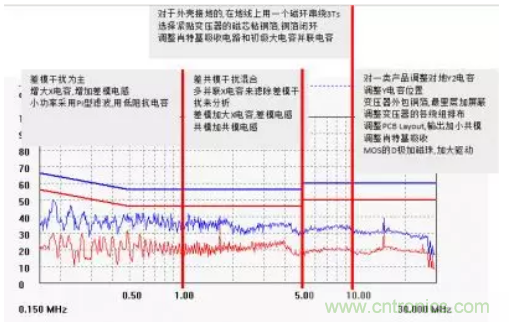 38.變壓器銅箔屏蔽主要針對傳導,線屏蔽主要針對輻射,當傳導非常好的時候,有可能你的輻射會差,這個時候把變壓器的銅箔屏蔽改成線屏蔽,盡量壓低30M下降的位置,這樣整改輻射會快很多。