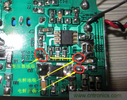 47.PCB的熱點區域一定要遠離輸入、輸出端子,防止噪聲源串到線上導致EMI變差,在不得已而為之時,可增加地線或其它屏蔽方式進行隔離,如下圖增加了一條地線進行有效隔離。