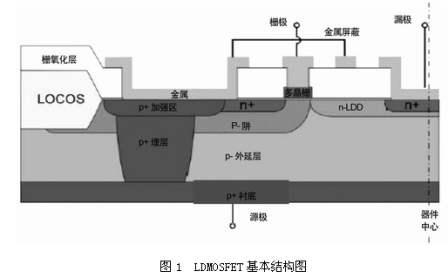 RF功率LDMOSFET是具有橫向溝道結構的功率MOSFET,它以LDMOSFET為基本結構,利用雙擴散技術在同一窗口相繼進行硼、磷兩次擴散,通過兩種雜質橫向擴散的結深之差精確控制溝道長度。其基本結構如圖1所示,由幾個關鍵結構組成: