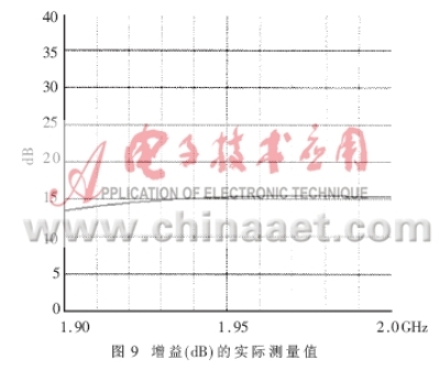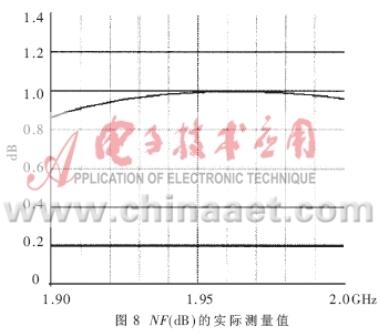 得到了完整的電路PCB板后,就要實際測量電路的各個參數,驗證設計的仿真結果是否與之相符,是否最終符合表1的設計技術規范。本文所采用的測試儀器是HP8753ES網絡分析儀和HP8970B噪聲儀。圖8、圖9表達出放大器實測的NF和增益曲線,在帶寬為0.1GHz的頻率范圍內NF的值在0.8dB和1.0dB之間,增益在1.97GHz達到最大值15.5dB,在1.99GHz達到了15.3dB。由于NF是在實際PCB板外腔體內測得的,包含了同軸連接器的損耗和二級噪聲損耗,其測量指標表明實際的電路NF特性要稍差于模擬特性。圖10是輸入、輸出的回波曲線。當頻點在1.96GHz時,輸入回波為18dB,輸出回波達到22.5dB,放大器的OIP3在直流偏置Vds=3V,Id=60mA時測得值為37dBm,P1dB為21.4dBm。電路在較低的偏置狀態下Vds=3V,Id=40mA放大器的NF和增益都沒有降低,只有OIP3測出下降為36.5dBm。