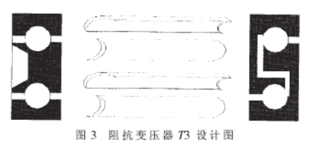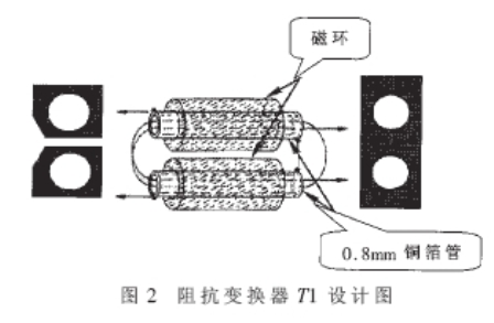 圖2中深色區域代表覆銅區域。銅箔管首先穿過磁環后再穿過兩端的銅膜板并焊接在一起,完成次級線圈。T2的設計基本與T1相似,只是使用同軸線SFF-1.5-1的芯線纏繞的初級線圈圈數不同而已。