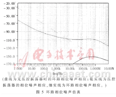 可見分頻式鎖相環(huán)路對于輸入信號、分頻器、檢相器的附加相位噪聲呈低通特性,對于壓控振蕩器的相位噪聲呈高通特性。環(huán)路相位噪聲仿真結(jié)果與該結(jié)論相符,見圖5。與普通倍頻器件相似,“低通型”的噪聲通過分頻鎖相環(huán)會增加N2倍,輸入?yún)⒖夹盘杹碜苑€(wěn)定信源,其信噪比較高,而分頻器輸出端很小的近旁頻信號在經(jīng)過