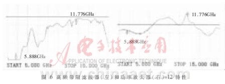 的連接線。濾波后采用低耗能的射頻放大器對信號進(jìn)行功率放大以彌補(bǔ)濾波器的通帶衰減。功率放大器電路設(shè)計(jì)主要是隔直電路的設(shè)計(jì),選用一級耦合微帶作為隔直電路,對11.776GHz信號增益可以達(dá)到10dB左右。圖6給出了用網(wǎng)絡(luò)分析儀測得的帶阻濾波器和功率放大器的s12特性。