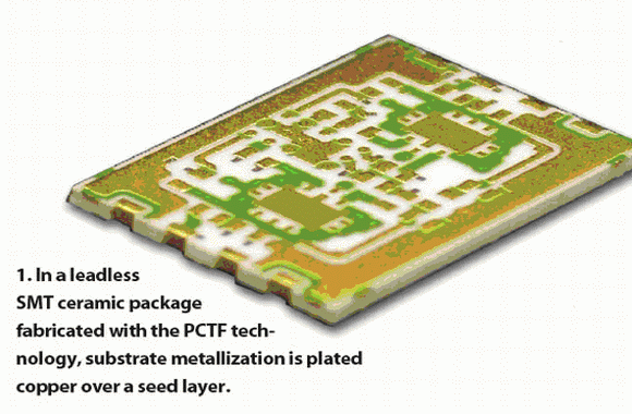 由于保密原因,這里不能提及軍事和航天用戶使用PCTF技術(shù)的具體方法。但是值得一提的是:高功率(10瓦)氣密無引腳SMT封裝器件,一般都是基于氧化鋁和鈹陶瓷襯底的。這些器件都經(jīng)過嚴(yán)格的加速老化和功能測試,能工作在14GHz的頻段。