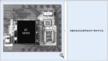 圖5:射頻-微機(jī)電系統(tǒng)試樣(圖中文字:完整的適應(yīng)性匹配網(wǎng)絡(luò)在單個(gè)模塊中實(shí)現(xiàn))