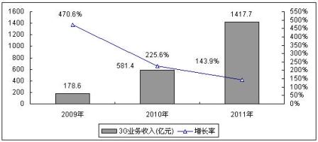 圖2 2009-2011年中國3G業(yè)務(wù)收入規(guī)模與增長預(yù)測