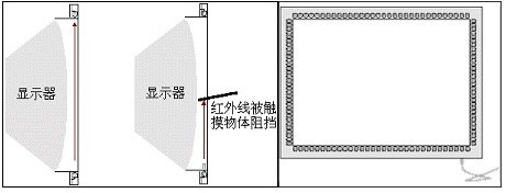 紅外觸摸屏是在緊貼屏幕前密布X、Y方向上的紅外線矩陣,通過不停的掃描是否有紅外線被物體阻擋檢測并定位用戶的觸摸。如下圖所示,這種觸摸屏是在顯示器的前面安裝一個外框,外框里設計有電路板,從而在屏幕四邊排布紅外發射管和紅外接收管,一一對應形成橫豎交叉的紅外線矩陣。每掃描完一圈,如果所有的紅外對管通達,綠燈亮,表示一切正常。