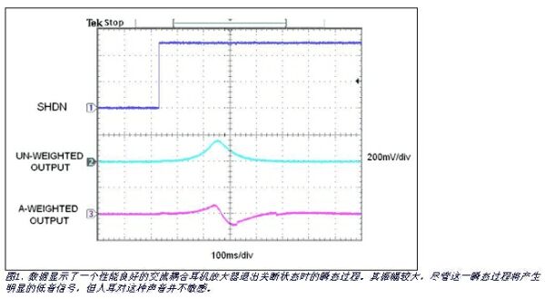 一個能夠接受、能夠檢測到的咔嗒聲抑制電平取決于多個因素:待測耳機(jī)/揚聲器的效率、人耳到轉(zhuǎn)換器之間的典型距離、SHDN循環(huán)頻率以及收聽時的背景噪聲電平等。