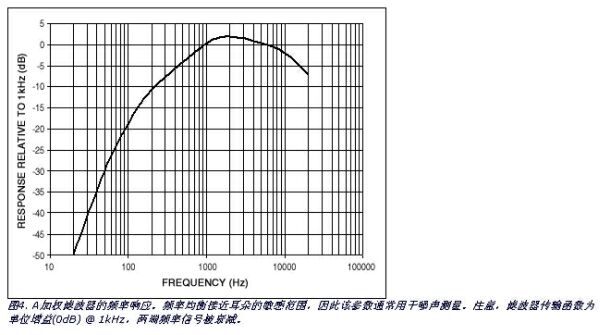 下一步,選擇分析儀的A加權(quán)濾波(建議)或非加權(quán)22Hz至22kHz濾波器,將測量帶寬限制在音頻范圍內(nèi)。請注意,示波器的快速高電平瞬變并不表明有多少能量出現(xiàn)在音頻頻帶內(nèi)。人耳對揚聲器或耳機(jī)瞬變信號的頻率響應(yīng)很有限。因此,增加A加權(quán)濾波(圖4)更有利于分析,因為這樣增強(qiáng)了人耳敏感的頻率分量。某些音頻分析儀不能選用A加權(quán),這種情況下,應(yīng)限制人耳頻率響應(yīng)的帶寬。音頻測試設(shè)備中常用的限制帶寬是22Hz至22kHz,帶寬限制濾波器大概能達(dá)到20kHz的平坦響應(yīng)(通常為人耳的上限)。
