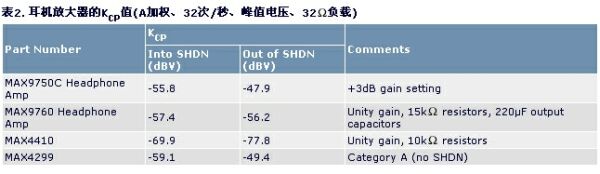 在很多應(yīng)用中,盡管許多因素會影響可接受咔嗒聲電平的建立,我們還是可以規(guī)定一個可信的指標(biāo)基準(zhǔn)。注意,Maxim耳機(jī)放大器B類咔嗒聲的測試結(jié)果(表2),所有測試均采用一個32負(fù)載電阻,每一KCP值代表每個端口四次采樣的平均值。
