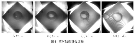 將紅外檢測應用到鍵合裝置中,可以實時監控鍵合過程。圖4(a)~(d)是截取的預鍵合過程中的4幅圖片,可以清晰地觀察鍵合波從中間向四周擴張的傳播過程。圖中所標的數字表示預鍵合時間(晶片經活化處理后,從兩晶片開始接觸到逐步鍵合所經歷的時間)。1 min后,鍵合面積基本不再發生變化,預鍵合結果如圖4(d)所示。