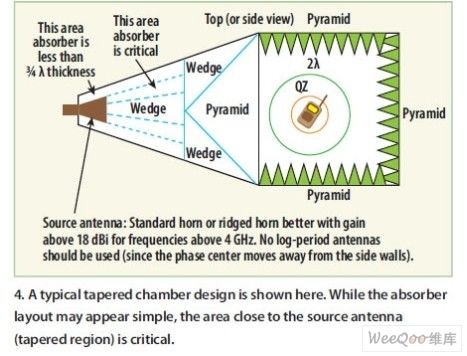 圖4:在典型的錐形暗室中,吸波材料的布局看起來很簡單,但離源天線較近的區域(錐形暗區域)非常重要。