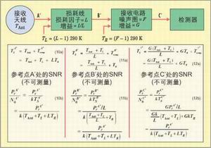 比較方程4~6中圖3的關系與方程10~12中圖4的關系可發現,前者隨著從A點移動到C點,信噪比的下降反映了實際測量結果。另一方面,后者從A''點到C''點,系統Pr/N0比保持固定,反映了一個在接收系統中各個選擇點產生系統(預檢波)信噪比的模型。這種模擬的預檢波SNR可表述在接收系統中的任何參考點處。在模型中,即使信號功率和系統溫度在接收系統中的各個位置互不相同,系統中任何選定參考點處的系統Pr/N0比(其中N0 = kTS)仍然是相同的。