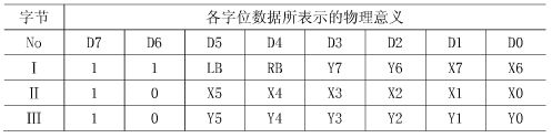 編碼的目的是將X和Y方向的位移改變量,連同鼠標按鍵的實時信息,按照標準的Microsoft鼠標協議要求的格式進行編碼,以便最后發送到主機的信息能夠被電腦正確識別,從而使電腦能正確處理發送給它的位移信號,來正確控制鼠標光標的移動等動作。表1表示的即是標準的鼠標協議規定的三字節數據包格式,第1個字節記錄的是左右按鍵的信息和鼠標X,Y位移的最高2個字位的數據,按鍵按下時,對應的位置1,否則,置0;第2和第3個字節分別記錄X和Y方向位移的低6位數據。位移值的范圍取-127~+127,再大的位移改變量會自動溢出。