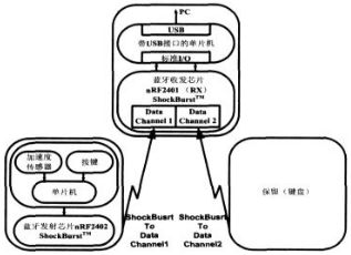 鼠標具體的工作原理為:鼠標內的單片機實時監測加速度傳感器的移動和按鍵狀態,當鼠標器的狀態發生變化時,單片機讀出按鍵狀態并及時得到當前X/Y坐標移動的位置;接著單片機就將變化的數據按照約定的通信協議將數據打包通過無線收發技術發送到接收端,接收端通過單片機解碼把符合鼠標USB協議的數據包送至PC主機的USB端口;PC中的鼠標驅動程序接收到端口的數據包后將其解碼再傳送給相應的應用軟件,從而完成鼠標器的檢測和控制過程。