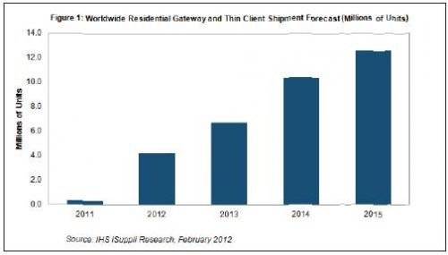 目前,住宅網關與充當接收器的瘦客戶box很少,但隨著有線及無線運營商開始推出提供更廣泛連接性與無縫接入的服務,其數量將急劇增長。2012年,全球網關與瘦客戶box的出貨量將達到420萬個,而去年只有34.5萬個,2010年更是只有1000個。未來幾年其出貨量將繼續快速增長,到2013年達到680萬個,2014年上升到1040萬個,2015年達到1260萬個,如圖1所示。