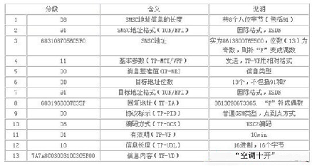 (1)記錄發(fā)送方手機號碼(上表第6、7部分),以便回復(fù)短信;(2)根據(jù)短信編碼方式(第8部分),對短信內(nèi)容進行解析。因編碼方式有7位、8位和16位(USC2),解碼程序也就不一樣(程序略);(3)進行密碼校驗,如密碼不正確,則直接將其刪除;(4)進行密碼校驗通過,且短信內(nèi)容符合相關(guān)約定,則將短信命令以特定協(xié)議格式轉(zhuǎn)發(fā)給相應(yīng)空調(diào),并將該短信刪除。因此,網(wǎng)關(guān)收到上面短信后,就將開機命令發(fā)給10號空調(diào);(5)在規(guī)定時間內(nèi),空調(diào)未返回執(zhí)行結(jié)果,網(wǎng)關(guān)將重發(fā)。如重發(fā)3次仍沒返回,則識系統(tǒng)通訊故障。