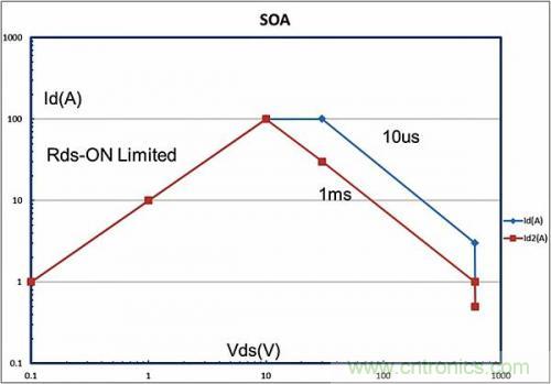 SOA曲線所圈出的另外一個(gè)重要區(qū)域受到Rds-On的限制。在這個(gè)區(qū)域內(nèi),器件上的電壓就是流經(jīng)器件的電流乘以導(dǎo)通電阻。在圖1所示的SOA曲線示例中,Rds-On為100毫歐。硅MOSFET的溫度取決于它們的Rds-On,這一點(diǎn)眾所周知。在器件溫度從25ºC升高至大約100ºC時(shí),它們的Rds-On幾乎會(huì)加倍。