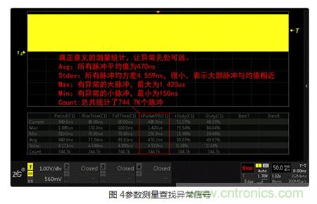 僅僅通過波形的直觀表現(xiàn)來分析異常信號遠遠不夠,只有將波形各項指標(biāo)精確量化,才能看透波形異常的本質(zhì)。ZDS2000系列示波器標(biāo)配的51種“真正意義”的參數(shù)測量,會把屏幕上捕獲的所有波形進行統(tǒng)計分析,得出每一項的當(dāng)前值、最大值、最小值、平均值、標(biāo)準(zhǔn)差、統(tǒng)計次數(shù),用戶通過觀察最大值和最小值可快速了解波形中可能存在的異常,通過觀察平均值、標(biāo)準(zhǔn)差可快速評估信號特性。