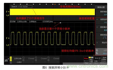 在調(diào)試異常信號時,我們通常需要明確,異常出現(xiàn)的頻率是多少,是不是周期性出現(xiàn)的呢?為了弄清楚這些問題,一般需要長時間記錄波形,然后基于這樣一個龐大的數(shù)據(jù)庫去定位和分析異常。ZDS2000系列示波器標(biāo)配的“搜索功能”,可以在海量的數(shù)據(jù)中快速定位出感興趣的信號,并自動做出標(biāo)記,用戶通過觀察標(biāo)記可快速了解異常的位置、頻率、周期等特性。