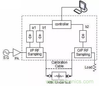 題外話:其實功率系數這個東東,不光是衰減器有,所有工作在大功率條件下的器件都有,只要工作功率的變化范圍比較大,就必須要考慮這個指標。如何測試這個指標,一般需要一套標準的測試系統,當然也可以自己來搭建。下圖就是上篇提到的一個標準的測試功率系數的框圖,供大家參考: