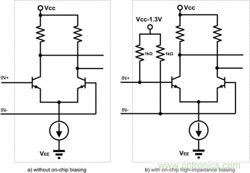 PECL 的輸入是一個具有高輸入阻抗的差分對,該差分對的共模電壓需要偏置到VBB =VCC-1.3V,這樣允許的輸入信號電平動態(tài)最大。對于不同芯片的輸入級,信號允許的共模電平可能會有些差異,請參考相應(yīng)的datasheet。有部分芯片在內(nèi)部已經(jīng)集成了偏置電路,使用時直接連接即可,有的芯片沒有加,使用時需要在芯片外部加直流偏置。