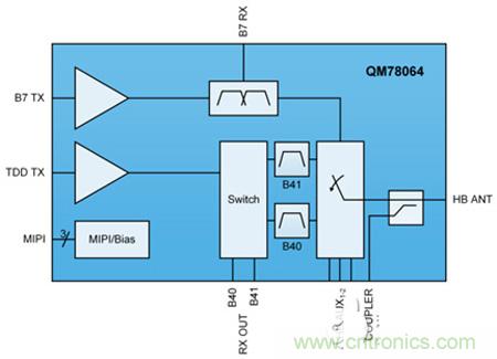 圖 1 所示為 RF Fusion QM78064 高頻段模塊,它同時支持 FDD-LTE(帶有集成頻段 7 雙工器)和 TDD-LTE(頻段 40 和 41),并搭載一個支持 20 MHz + 20 MHz 上行載波聚合的寬帶 B41 LowDrift™ BAW 濾波器。該模塊還配備一個天線開關并支持包絡跟蹤 (ET) 和平均功率跟蹤 (APT),以盡可能減少能源消耗。