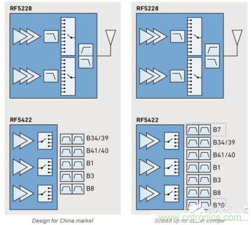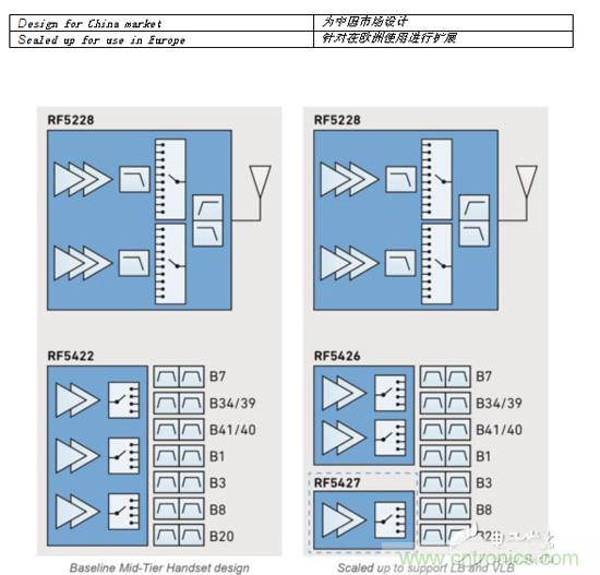 場景 1 制造商設計了一款采用 RF5422 多頻段 PA 模塊和 RF5228 高級發送模塊的中端手機。RF5422 提供所有必要的 3G 和 4G PA 功能;RF5228 為所有頻段提供 2G 支持和天線開關功能。針對中國市場,制造商添加了濾波器以支持 1、3、8、34、39、40 和 41 頻段。通過簡單添加頻段 7 和 20 的濾波器,即可針對歐洲的使用來對相同設計進行擴展。制造商可以在兩個區域使用相同的 PCB 設計,并根據需要在 PCB 中添加濾波器。