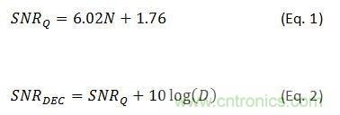 例如,要使抽取因子為2,必須讓信號(hào)的過采樣因子至少為2。在這個(gè)例子中,信號(hào)功率保持不變,但奈奎斯特帶寬被減半。這就消除了一半的噪聲功率,從而讓該ADC的SNR增加了3dB。第一個(gè)方程式表示因量化噪聲得到的理想SNR,其中N是該轉(zhuǎn)換器的位數(shù)。第二個(gè)方程式則表示與抽取因子D相關(guān)的SNR改善值。