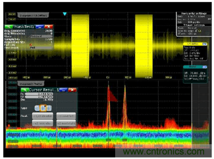 很多用慣了示波器的人都喜歡示波器的觸發(fā)功能,用各種觸發(fā)方式來(lái)隔離各種事件,穩(wěn)定顯示,觀察異常。在傳統(tǒng)頻譜儀上是很難實(shí)現(xiàn)觸發(fā)的,但是當(dāng)我們發(fā)現(xiàn)示波器的模板觸發(fā)方式,很容做到,把時(shí)域波形的實(shí)時(shí)頻譜變到頻域來(lái)觀察,借助MASK 測(cè)試的一些小工具,居然輕松設(shè)置和輕松觸發(fā)。因?yàn)槟0宓男螤钭杂删庉嫞|發(fā)的動(dòng)作自由組合,這樣的波形分析已經(jīng)完全跨越的時(shí)域和頻域的使用習(xí)慣,完全融合了時(shí)域和頻域?qū)π盘?hào)的思維方法了。