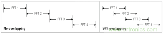 RS 的示波器在對(duì)采集的樣本進(jìn)行片段處理,把一次采集的信號(hào)分成很多小段進(jìn)行處理,這樣能看到一次采集里邊的頻譜內(nèi)容變化。但是光分片段處理還不能避免丟失,因?yàn)樵趂ft 運(yùn)算之前,已經(jīng)有窗函數(shù)的處理,不可避免的在相鄰兩幀的位置有頻譜信息丟失,所以我們采取了另外一種更加創(chuàng)新的方法,運(yùn)用了fft 的交疊算法,極大地提高的窗函數(shù)的影響,以及異常頻譜的丟失。