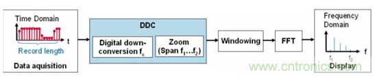 上圖的對(duì)比可以看出來(lái),在窗函數(shù)之前會(huì)進(jìn)行一個(gè)DDC 處理,通過(guò)用戶設(shè)置中心頻率,設(shè)置初始和截止頻率,處理的結(jié)果是只對(duì)關(guān)心的頻段,或者說(shuō)設(shè)定好的頻段進(jìn)行處理。傳統(tǒng)方式必須對(duì)所有頻段范圍的進(jìn)行fft 運(yùn)算,然后選擇一段頻率來(lái)顯示,運(yùn)算的數(shù)據(jù)量非常大。反過(guò)來(lái)我們的原理是僅對(duì)你感興趣的頻段或者你選擇的初始頻率和截止頻率范圍內(nèi)進(jìn)行處理,當(dāng)然極限情況也是選擇全頻段來(lái)處理,這樣就有機(jī)會(huì)減少數(shù)量量的處理,把處理能力集中在DDC 之后的范圍內(nèi)。下面兩張圖更加清晰告訴傳統(tǒng)方式和我們方式的區(qū)別。