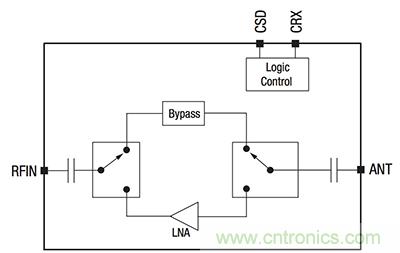 圖 1: Skyworks 的 SKY66113-11 將 LNA 與數字控制集成。該器件還使用了旁路開關,讓系統可以根據需要在無 LNA 的情況下工作。(圖片來源: Skyworks)