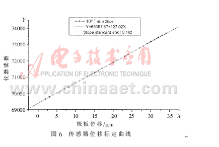 從最后獲得的極板位移與比率變壓器讀數的關系式(6)可知,讀數隨中心電極的位移呈線性變化。實際完成的系統由于結構的不完善性,在接近量程的兩端會出現一定程度的非線性,如果采取等電位屏蔽等措施,可以把輸出特性的非線性降低到可以忽略的程度。可見,將差動式電容位移傳感器與比率測量方法結合起來,設計的測量系統既有很高的分辨能力及較強的抗干擾能力,也能夠獲得很好的線性響應。