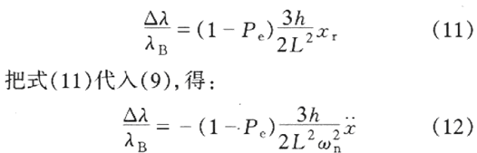 可見(jiàn)光柵的應(yīng)變ε與質(zhì)量塊相對(duì)于機(jī)座的位移xr之間成線性關(guān)系.另外,根據(jù)式(1),光纖光柵的布拉格波長(zhǎng)變化與位移xr間的關(guān)系為: