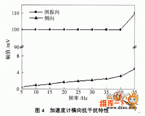 對(duì)單自由度的低頻光纖光柵加速度計(jì)來(lái)說(shuō),橫向抗干擾特性也是一項(xiàng)重要指標(biāo).實(shí)驗(yàn)在加速度計(jì)的測(cè)振方向以及與其垂直的側(cè)向分別加0.5g的加速度,在5~45 Hz的頻帶范圍內(nèi)對(duì)兩個(gè)方向的振動(dòng)值進(jìn)行了對(duì)比,測(cè)量結(jié)果如圖4所示.從圖中可以看出,在加速度計(jì)的測(cè)振方向激振時(shí)加速度計(jì)測(cè)量輸出維持在100 mV 附近,而在與測(cè)振垂直方向激振時(shí)輸出在1~4mV范圍內(nèi),其橫向抗干擾能力達(dá)40 dB.可見(jiàn)此種設(shè)計(jì)方案可以有效降低橫向干擾的影響.