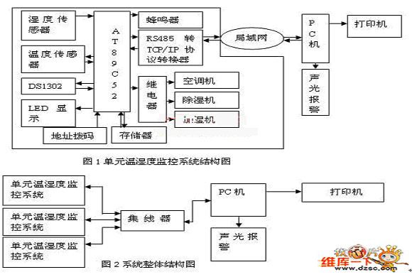 可根據(jù)實際情況由若干單元溫濕度監(jiān)控系統(tǒng)通過集線器組成一個完整的遠(yuǎn)程分布式溫濕度智能監(jiān)控系統(tǒng)(系統(tǒng)整體結(jié)構(gòu)圖見圖2)。