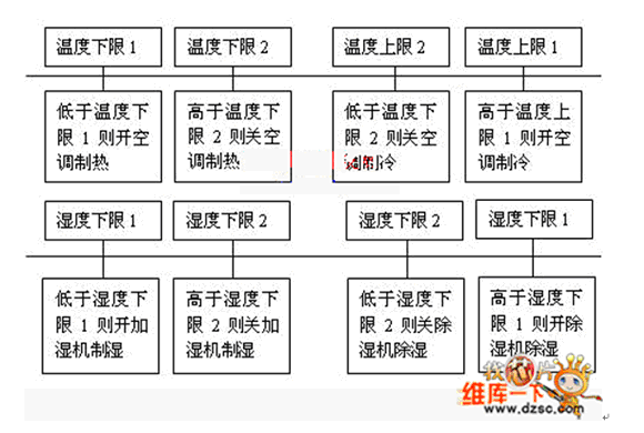 上電初始化,根據(jù)板子的撥碼開關(guān)的狀態(tài)讀取并保存溫濕度儀地址;讀取存在外存中的上次已設(shè)置好的溫濕度上下限的歷史值和保存的采樣間隔歷史值。然后,進入主循環(huán)中,根據(jù)采樣間隔時間,將溫度、濕度、等數(shù)據(jù)存入外存,點亮LED數(shù)碼管顯示當(dāng)前時間、溫度、濕度,并根據(jù)已設(shè)置好的溫濕度上下限值來確定是否驅(qū)動蜂鳴器報警且控制空調(diào)機、加濕機、除濕機工作進行溫濕度控制調(diào)節(jié)[7](溫濕度上下限控制示意圖見圖3)。系統(tǒng)有良好的交互性能,利用中斷可在線隨時設(shè)置時間校正值、溫濕度上下限值、采樣間隔時間值、溫濕度校正值并將這些數(shù)據(jù)存到外存中;可在線提取當(dāng)前溫濕度數(shù)據(jù)和溫濕度儀狀態(tài)等數(shù)據(jù);可由相應(yīng)指令提取根據(jù)采樣間隔已存在外存中的歷史溫濕度數(shù)據(jù)。