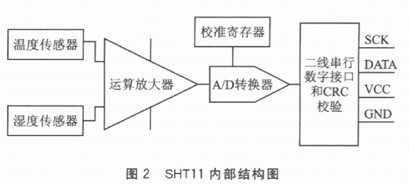 溫濕度傳感器SHTll集溫度傳感器和濕度傳感器于一體,因此采用SHTll進行溫濕度實時監測的系統具有精度高、成本低、體積小、接口簡單等優點;另外SHTll芯片內部集成了14位A/D轉換器,且采用數字信號輸出,因此抗干擾能力也比同類芯片高。該芯片在溫濕度監測、自動控制等領域均已得到廣泛應用。