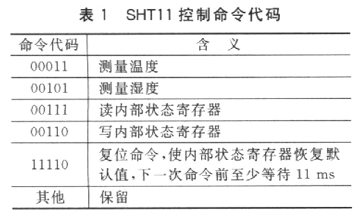 微處理器是通過二線串行數字接口與SHTl1進行通信的。通信協議與通用的I2C總線協議是不兼容的,因此需要用通用微處理器I/O口模擬該通信時序。微處理器對SHTll的控制是通過5個5位命令代碼來實現的,命令代碼的含義如表1所列。