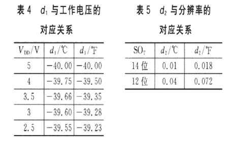 式中:d1和d2為特定系數,d1的取值與SHTll工作電壓有關,d2的取值則與SHTll內部A/D轉換器采用的分辨率有關,其對應關系分別如表4和表5所列。